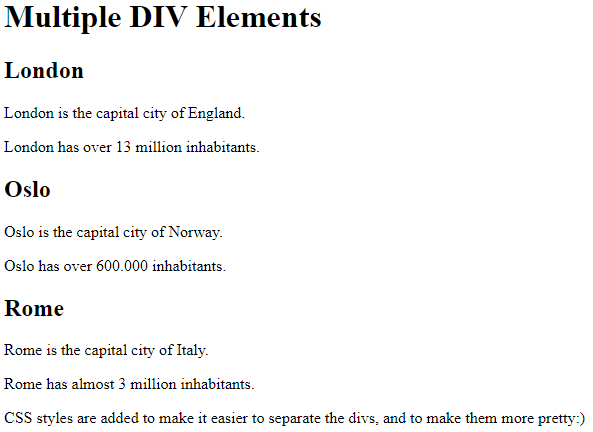 여기서 div의 역할은 단지, 각 도시의 이름과 설명 두 문장을 그룹으로 묶는 역할이다.