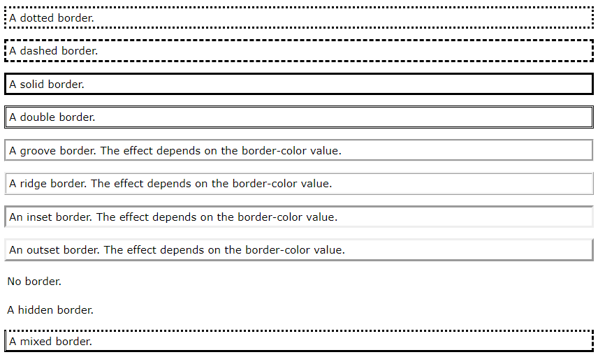 | border-style | solid dotted dashed double groove ridge inset outset none hidden dotted |