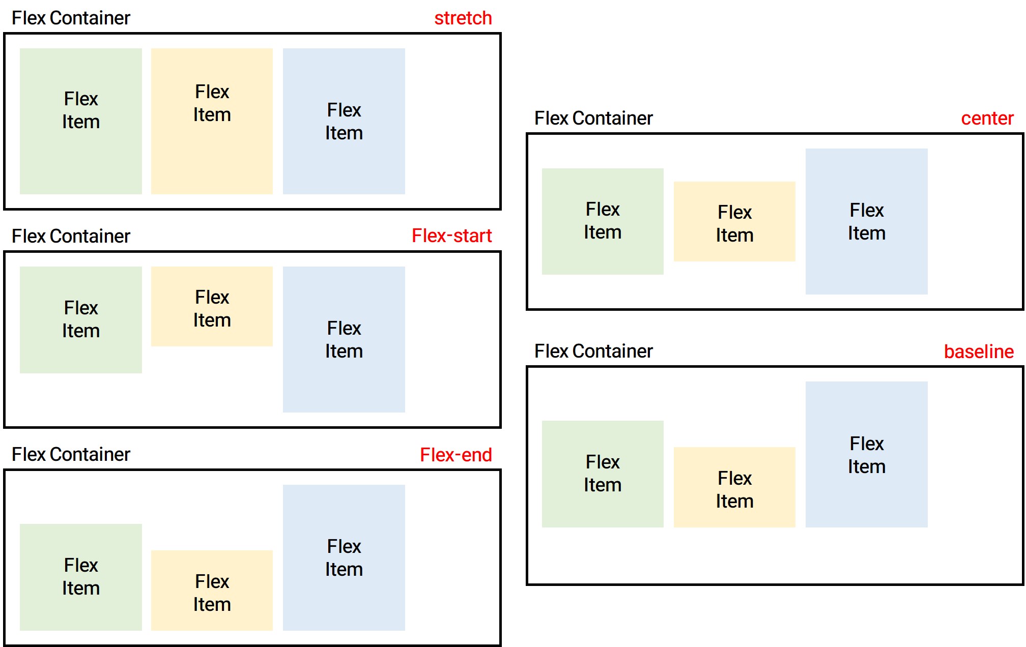 속성값으로는 stretch, flex-start, flex-end, center, baseline이 있다.
