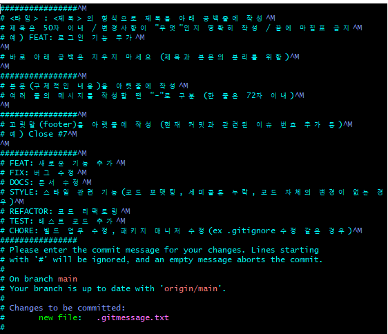 그리고 이 파일 안에 커밋 메시지의 템플릿을 작성하면 되는데,