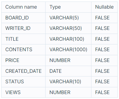 BOARD_ID, WRITER_ID, TITLE, CONTENTS, PRICE, CREATED_DATE, STATUS, VIEWS은