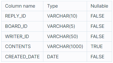 REPLY_ID, BOARD_ID, WRITER_ID, CONTENTS, CREATED_DATE는