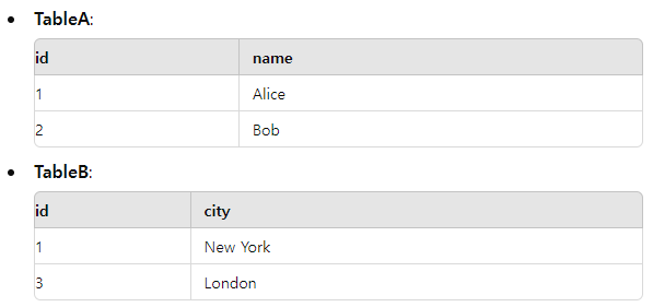 아래의 예시로 각 JOIN을 설명해보자.