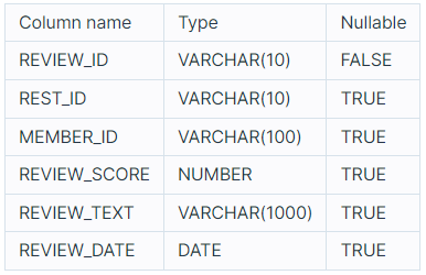 REVIEW_ID, REST_ID, MEMBER_ID, REVIEW_SCORE, REVIEW_TEXT, REVIEW_DATE는